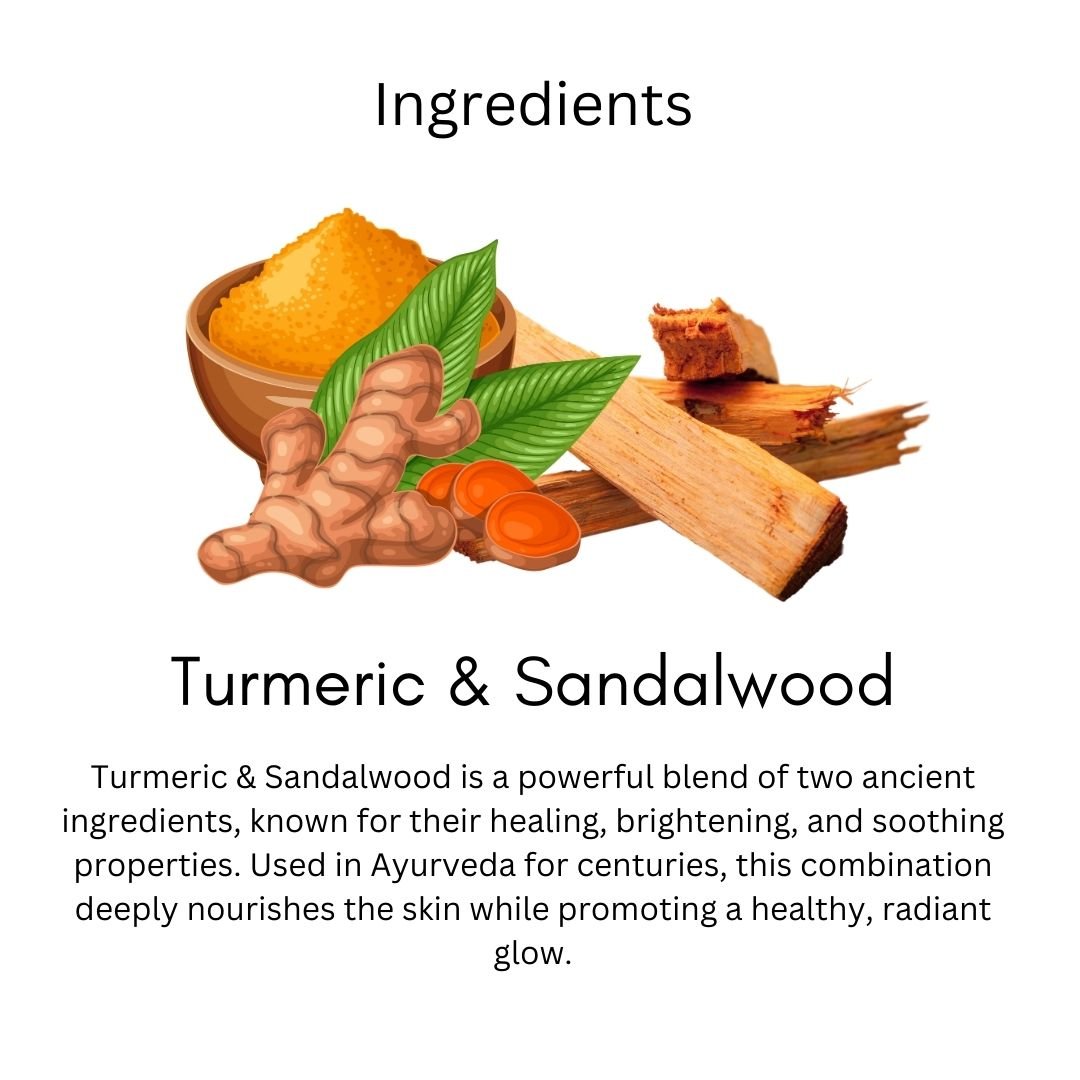 A herbal handmade soap enriched with turmeric and sandalwood to brighten, soothe, and nourish your skin.Helps reduce blemishes, tan, and dullness while leaving skin soft, smooth, and refreshed.